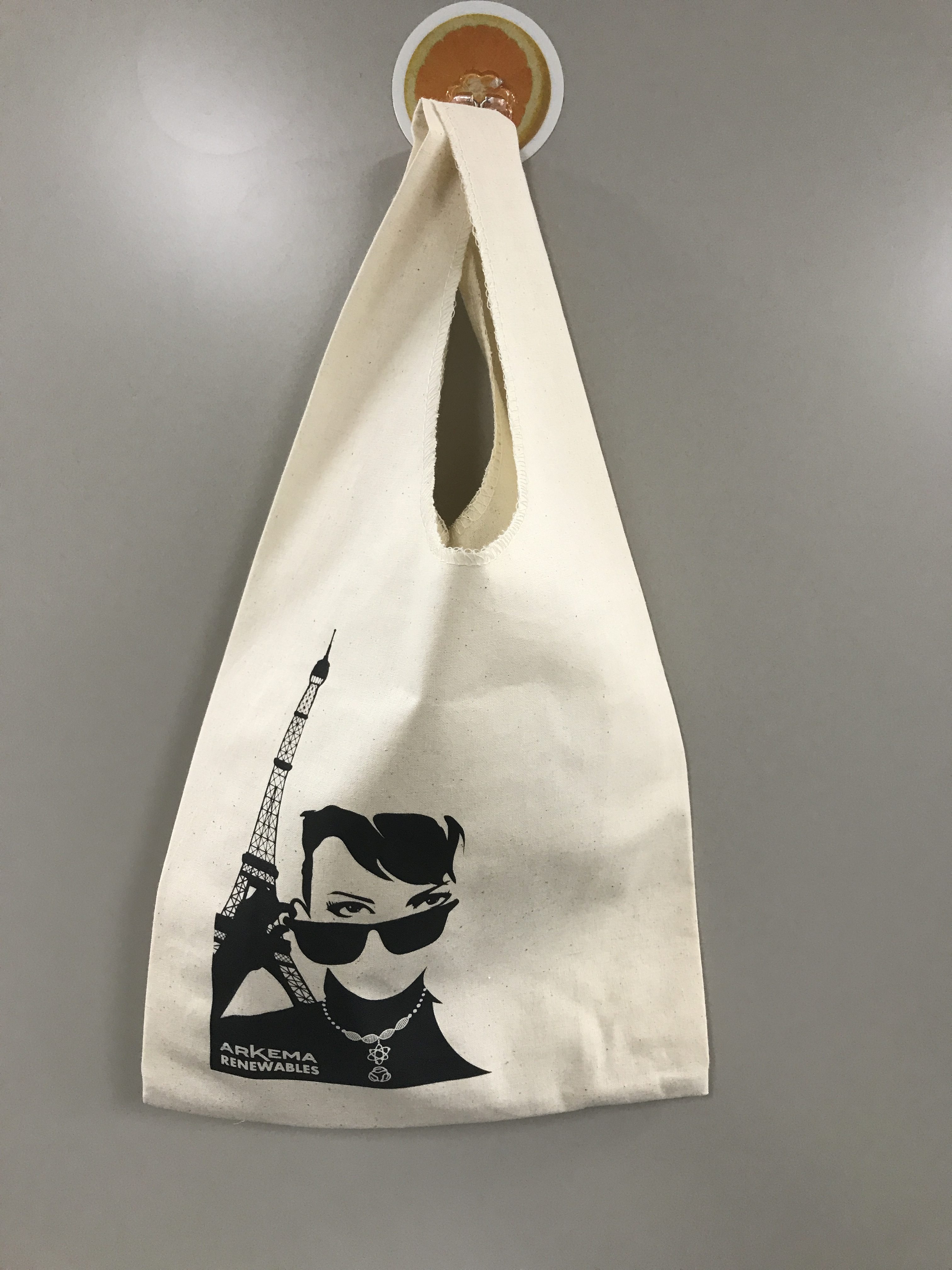 展示会で配布のノベルティをお探しで、お問い合わせ頂きました。展示のアイテムが「樹脂」なのだそうですが、工業的ではなくオシャレな感じの物をお探しとの事で、オシャレな人たちの間で人気の「マルシェバッグ」を提案させて頂きました。