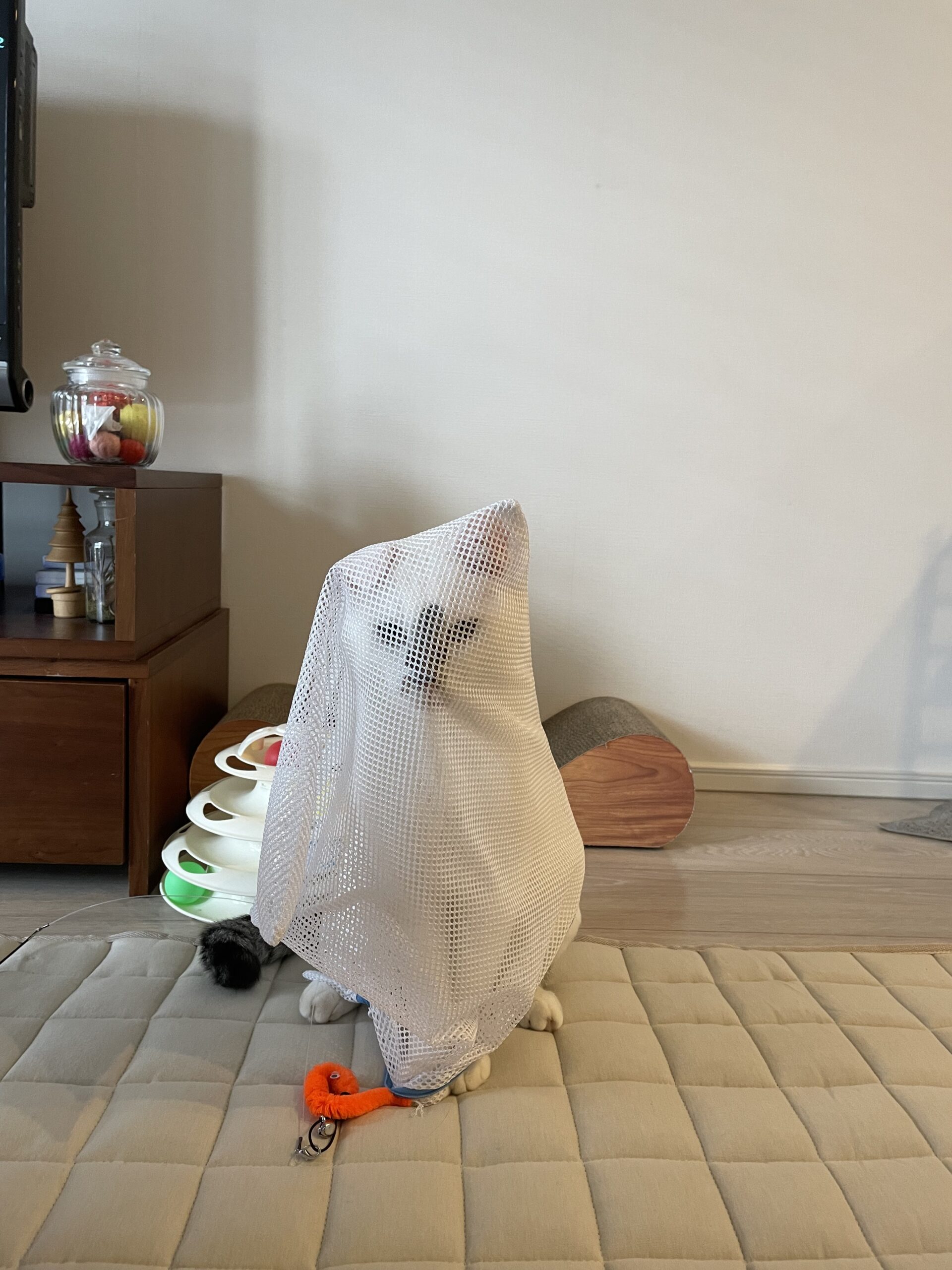 ふと振り返ると、洗濯ネットを被ったトトちゃん!笑 おばけ👻の真似かな?