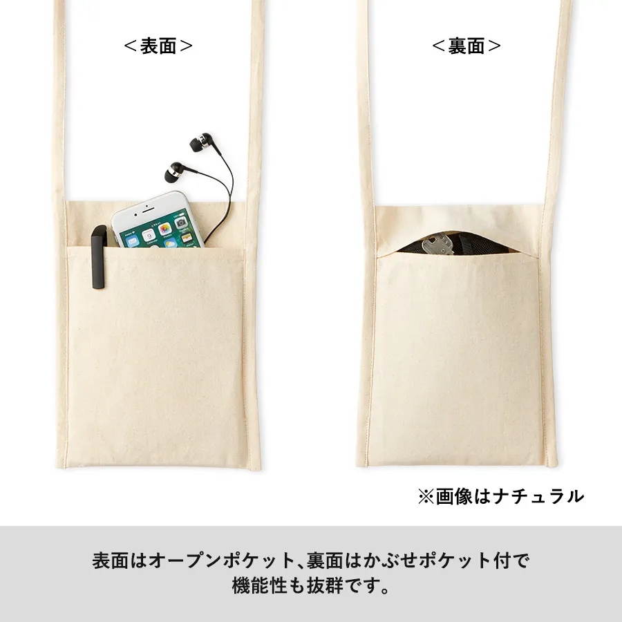 斜め掛けできる長めのショルダー紐と、表のオープンポケット・裏のかぶせポケットの2つのポケットで、小さいながらも使い勝手のよいアイテムです。