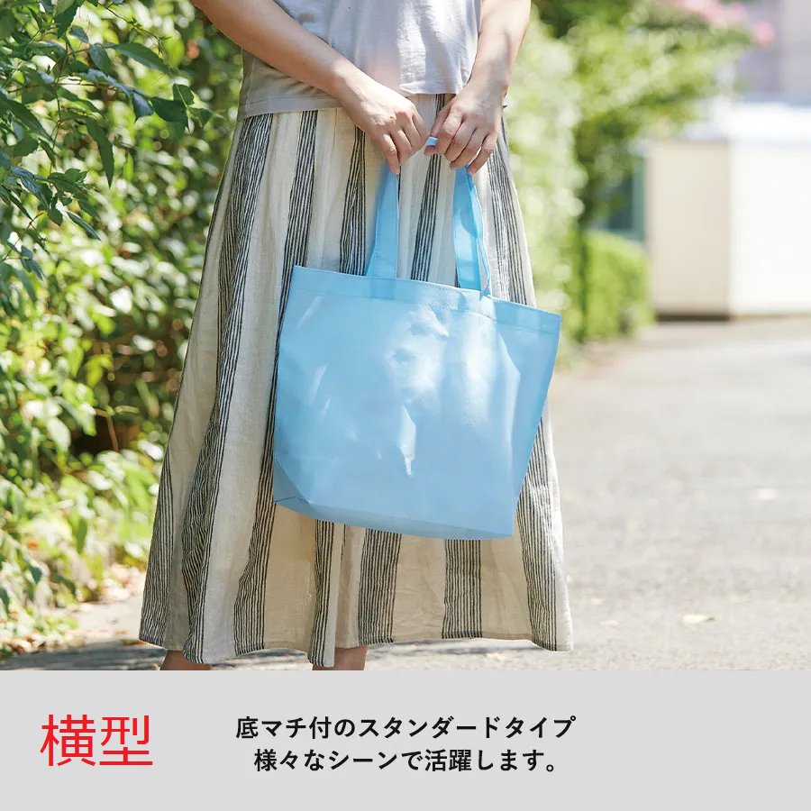 軽くて丈夫な不織布を用いた底マチ付のトートバッグです。