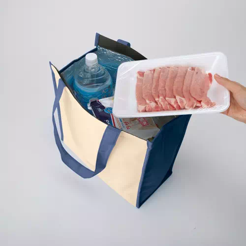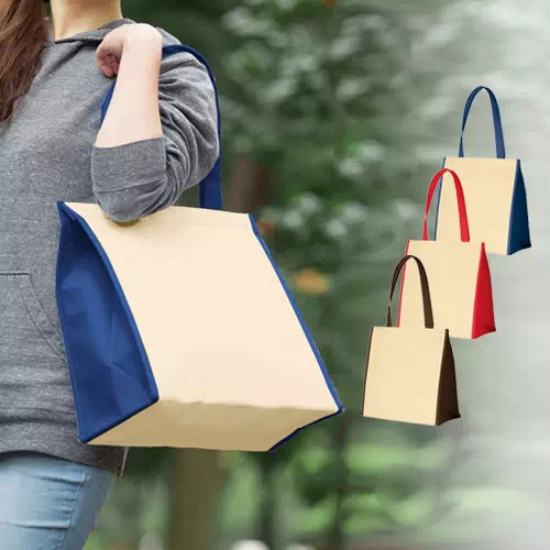 マチと持ち手に差し色が入る、アクセントカラーがポイントの不織布保冷バッグです。